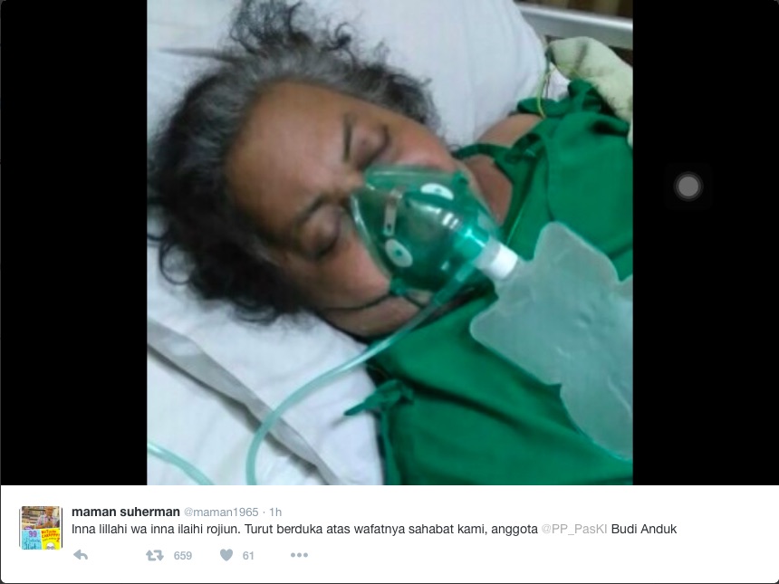 Kabar meninggalnya Budi Anduk tersebar sejak artis Melanie Subono menulis dalam akun Twitternya. ”Selamat jalan Mas Budi Anduk, makasih udah menghibur, dan pernah ksh gw surprise sbg fans besarmu. Buatlah surga tertawa ya,” tulis Melanie.